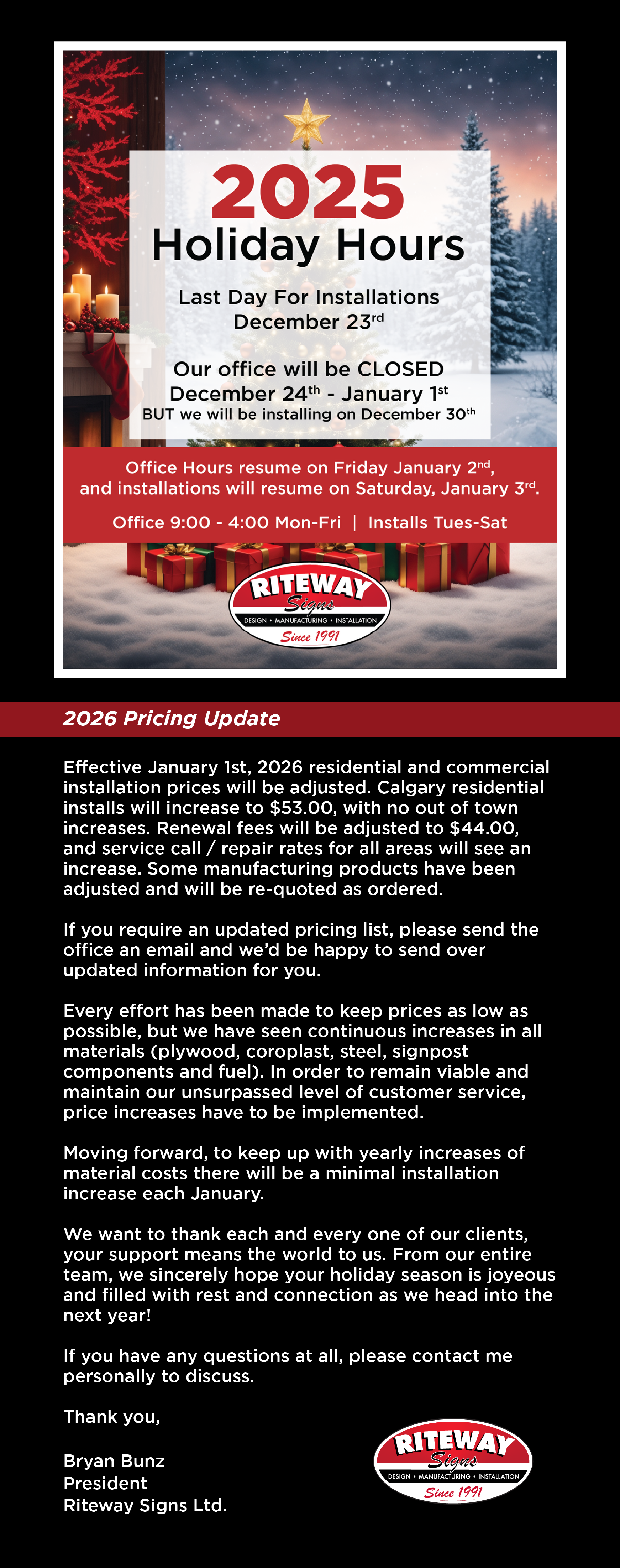 Riteway Signs is a family-owned and -operated real estate sign company that has been serving Calgary and surrounding areas for nearly 30 years. Riteway is a primary service provider for real estate brokerages, property management agencies, renovation companies, and home builders.